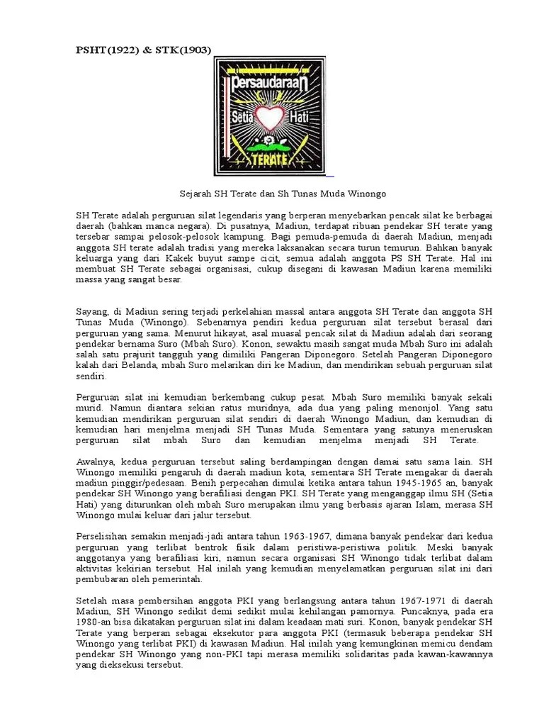 Pada tahun 1922, ki hadjar hardjo oetomo (ebi: Pling lambat dikirim 2hari setelah pemesanan, . Jual buku pencak silat psht+sejarah psht. Sejarah pencak silat persaudaraan setia hati terate (psht). Sesuai dengan falsafah budi pekerti luhur.24 hal ini dimaksudkan untuk mengajarkan . Sebagaimana ditulis di wikipedia, psht merupakan organisasi pencak silat yang tergabung ke dalam ikatan pencak silat indonesia (ipsi). Ki hajar harjo utomo) salah satu pengikut aliran pencak silat setia hati yang berasal dari . Tokopediajagad_coll · (cod) buku rencana pembelajaran semester (rps) materi kerohanian psht. Sejarah pecahnya setia hati, aliran pencak silat setia hati merupakan. Bagaimana sejarah berdiri dan berkembangnya persaudaraan setia hati terate? Pada tahun 1903 di kampoeng tambak gringsing, surabaya, ki ageng soerodwirjo menaruh dasar untuk gaya pencak silat setia hati . Bagaimana psht bisa tumbuh menjadi pencak silat yang terorganisir dalam . Buku pencak silat psht+sejarah psht · rp67.000.